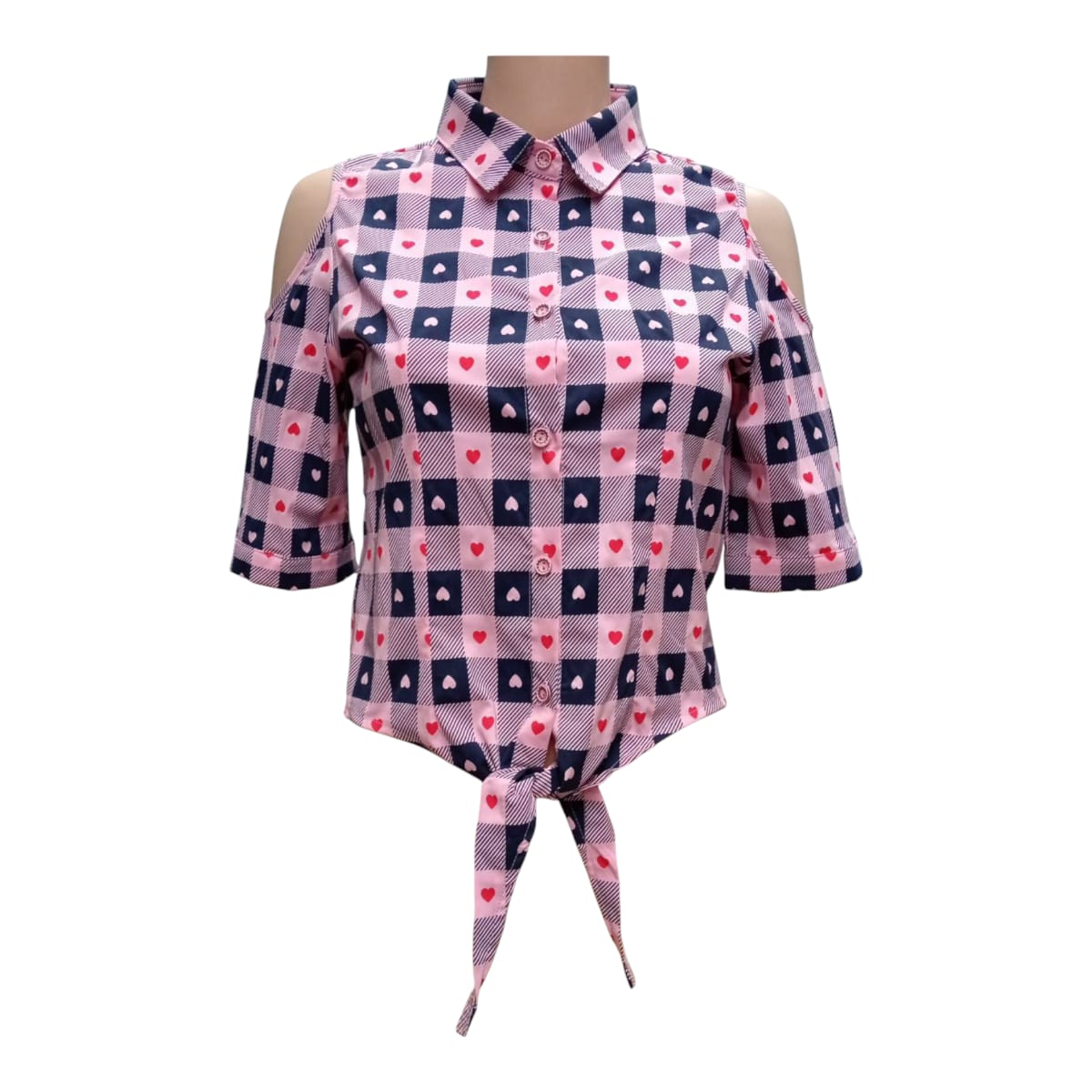 Blusa T091, Blusa abierta,manga corta con hombro descubierto, cuello sport y detalle de nudo, talla juvenil