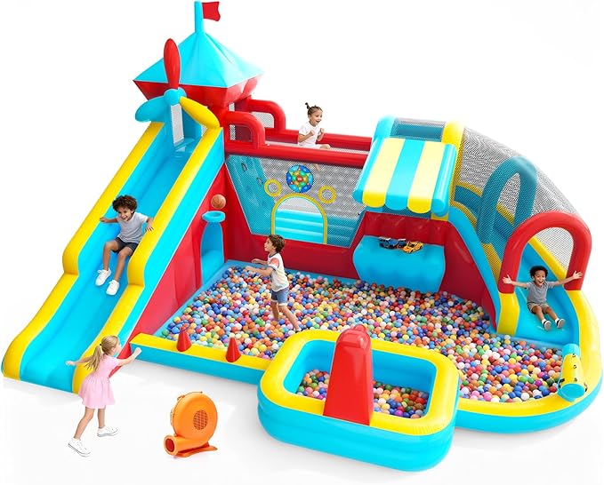 - [Modo de juego 10 en 1] Esta casa inflable de rebote está llena de diversión. Cuenta con dos toboganes, un muro de escalada, un aro de baloncesto, un lanzamiento de anillo, una gorila, un túnel, una piscina, cañones de agua, un juego objetivo e incluso un área de almacenamiento de juguetes. Cada actividad está diseñada para mantener a los niños activos, comprometidos y crear recuerdos inolvidables.