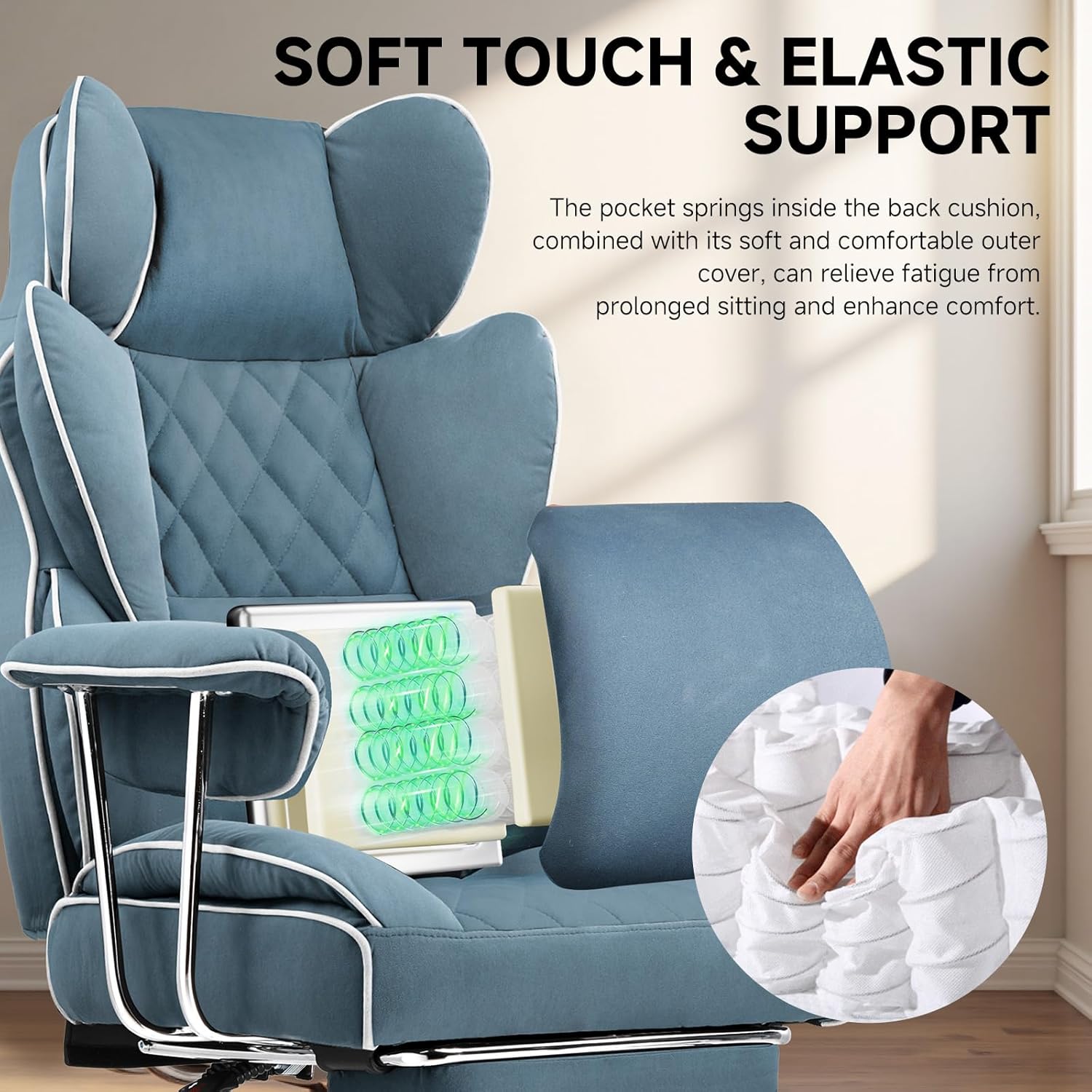 - Asiento cómodo multifuncional: el asiento espacioso sin alas laterales restrictivas combina soporte lumbar de resorte bolsillo para mayor comodidad y transpirabilidad, manteniéndote fresco durante largas horas de sentado. El reposapiés ajustable te permite cambiar sin esfuerzo entre los modos de trabajo y relajación para una máxima comodidad.