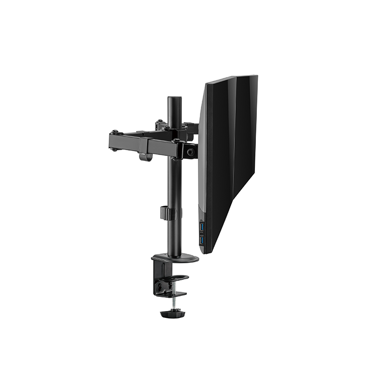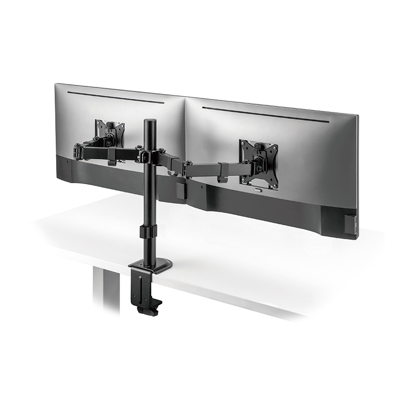 Soporte universal 17″–32″ de acero con doble brazo, inclinación libre, giro 360°, montaje vertical/horizontal y clip para cables. Ideal para setups ergonómicos.