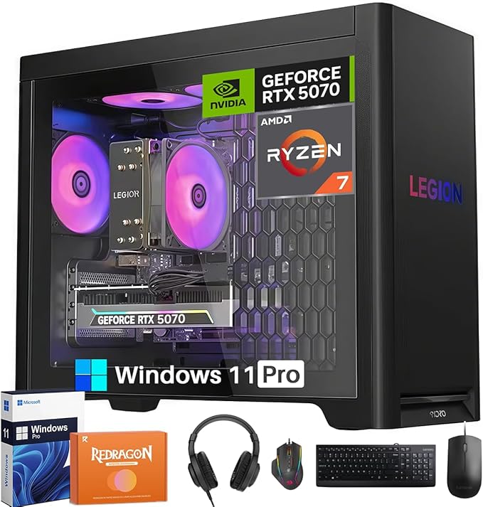 Lenovo Legion Tower 5 Gaming Desktop, AMD Ryzen 7 7800X3D NVIDIA GeForce RTX 5070 12GB GDDR7, 64GB DDR5 5600MT/s, 2TB SSD, 2TB HDD, Whisper-Quiet Legion Cooling, Windows 11 Pro, REDRAGON Accessories