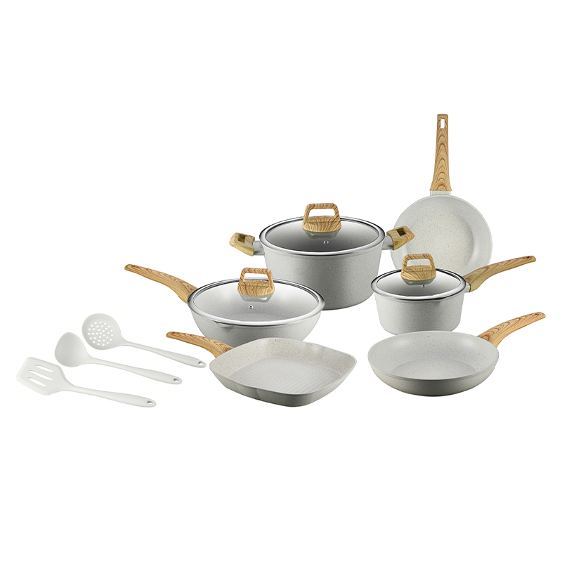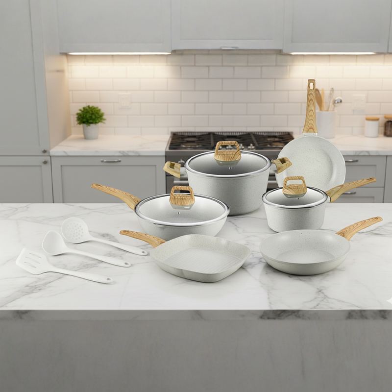 Batería de cocina Ericeira de 12 piezas con recubrimiento de mármol de 4.5 mm de grosor, ideal para cocinar con estilo y eficiencia. Incluye cacerolas, sartenes, wok y sartén grill con mangos ergonómicos resistentes al calor, efecto madera y acabado soft touch. Complementada con utensilios de silicón para una experiencia completa y segura en la cocina.