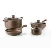 La batería de cocina Monza de 7 piezas incluye 1 olla, 1 wok, 1 sartén y 1 cacerola con 3 tapas de vidrio y sellos de silicón. Su recubrimiento de mármol antiadherente de 2.5 mm asegura durabilidad y fácil limpieza. Mangos ergonómicos resistentes al calor y elegante diseño turquesa que realza tu cocina.