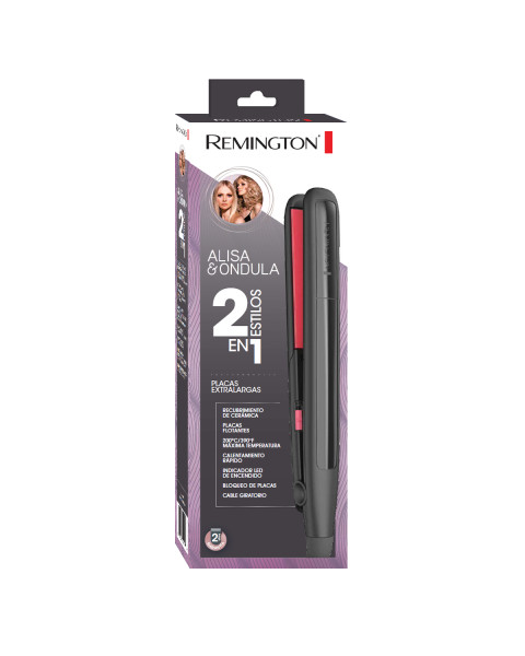 Plancha de cabello Remington Alisa y Ondula 2 estilos en 1, con forma redondeada que puedes alisar y ondular con la misma plancha. Mayor versatilidad y comodidad con la misma herramienta. La plancha de cabello Remington es de calentamiento rápido en 30 segundos hasta una temperatura máxima de 200 °C, ideal para estilizar todo tipo de cabello. Además tiene placas extralargas de 110 mm, para alisar porciones de cabello más anchas y así acabar más rápido. La plancha de cabello Remington cuenta con placas flotantes para un deslizamiento más suave. Garantía de 2 años.