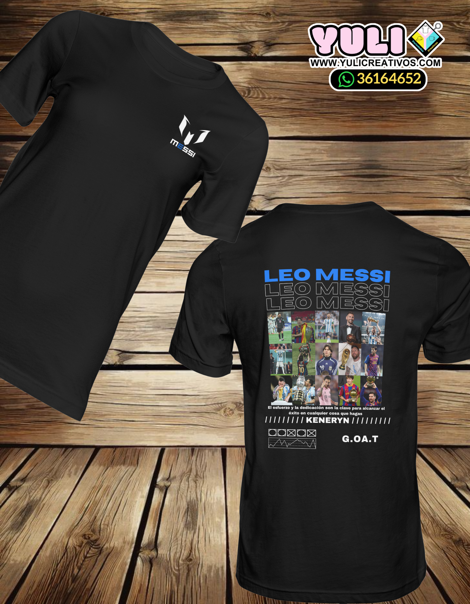 Playera de algodón en color blanco o negro, de Leo Messi, contiene collage de fotos, texto y gráficos