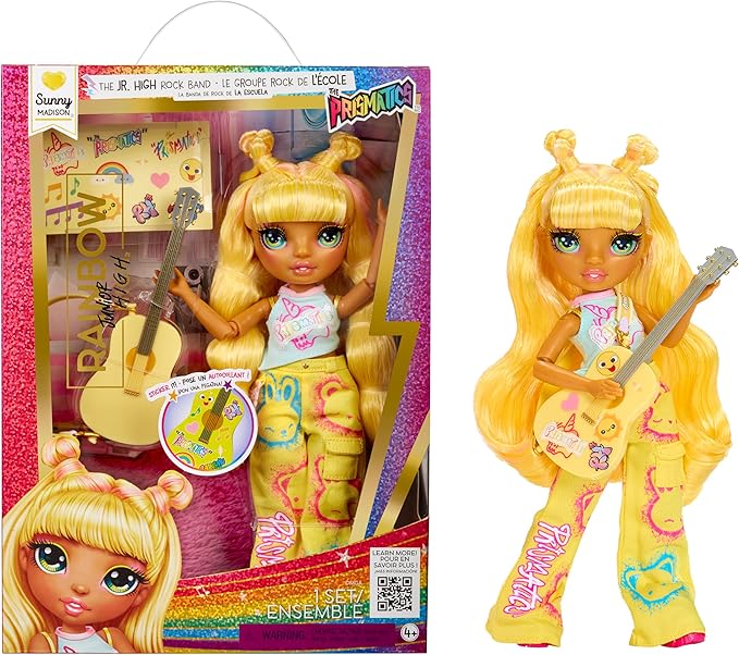 Rainbow High Jr High Rock Band – Sunny, Yellow 9” Fashion Doll with Guitar, Customize with Stickers, Posable, Great Toy Gift for Kids Ages 4+