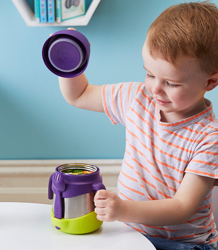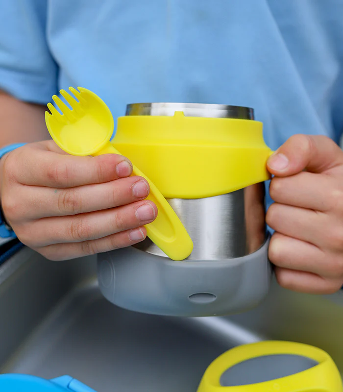 Mantiene la comida a la temperatura perfecta todo el día, ya sea que los niños prefieran pasta caliente para el almuerzo o fruta y yogur fríos y refrescantes. Ideal para preescolar y colegio, con una capacidad de 335 ml. Incluye un tenedor-cuchara que se guarda en un protector personalizado.